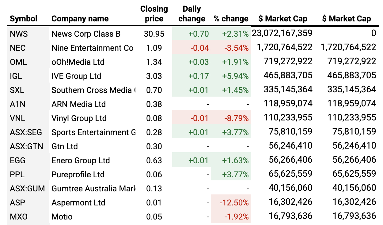 Ive led the risers, up 5.94%, followed by SEG up 3.77% and Pureprofile also up 3.77%. News Corp rose 2.31%, Ooh Media was up 1.91%, Enero rose 1.63% and Southern Cross edged up 1.45%, rounding out a day that saw the Index finish down 1.08% at 442.9.