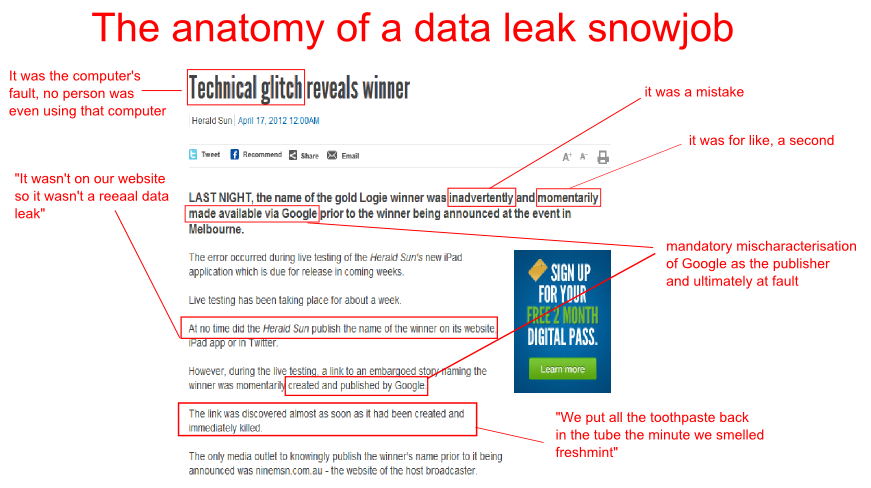 For those of us still bewildered by the Herald Sun’s attempt to pass the buck as to how it accidentally revealed details of the Logies winners last night, Twitter personality and scourge of the disingenuous @GeordieGuy has helpfully explained all…