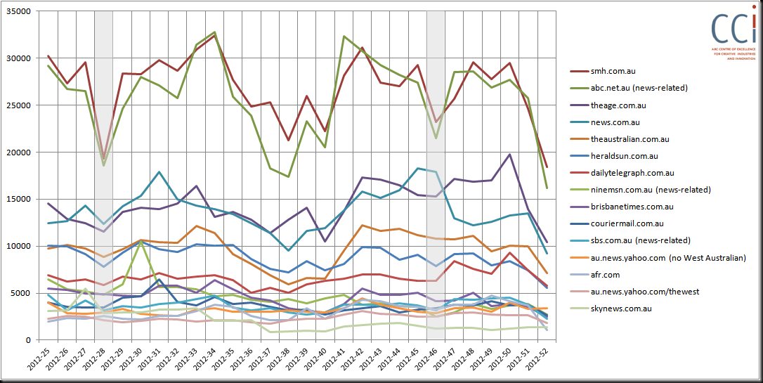 The SMH online and ABC lead well above their competitors on the top tier, followed by The Age and News.com.au on a second tier and then followed by other major media outlets clubbed broadly together on a third tier.