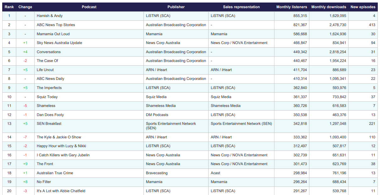 ABC’s Conversations has climbed four places to sit in fifth place and — most importantly — had the most downloads for the month of any Australian podcast, with 2.8 million across 31 shows.