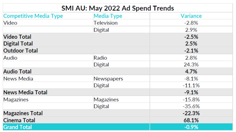 However, for the month of May SMI reported more patchy ad demand, with digital bookings up just 2.1%, though key sectors including search, social media and video sites delivered higher growth rates. Similarly, video ad spend (excluding UAP) was back 2.5% but within that linear regional TV bookings grew 7.2%. In addition, the audio (+4.7%) and cinema (+68%) media delivered growth on a standalone basis.