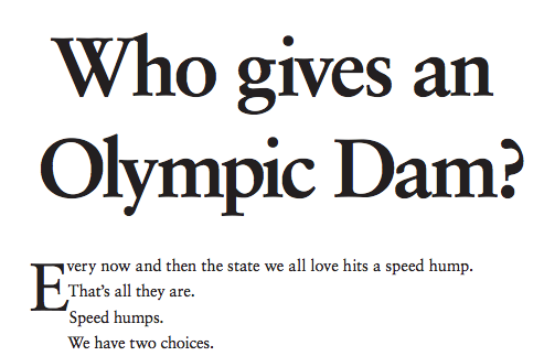 South Australia has a great deal more to offer than simply being the location of the world’s biggest hole in the ground. There is a lot to celebrate in the fact that the Olympic Dam project has stalled; for a start, Adelaide and its many attractions – including Fringe, Womad, the divine wine regions nearby, the home of the rare leafy seadragon – will be safe (for now) from the biggest uranium mine in history.