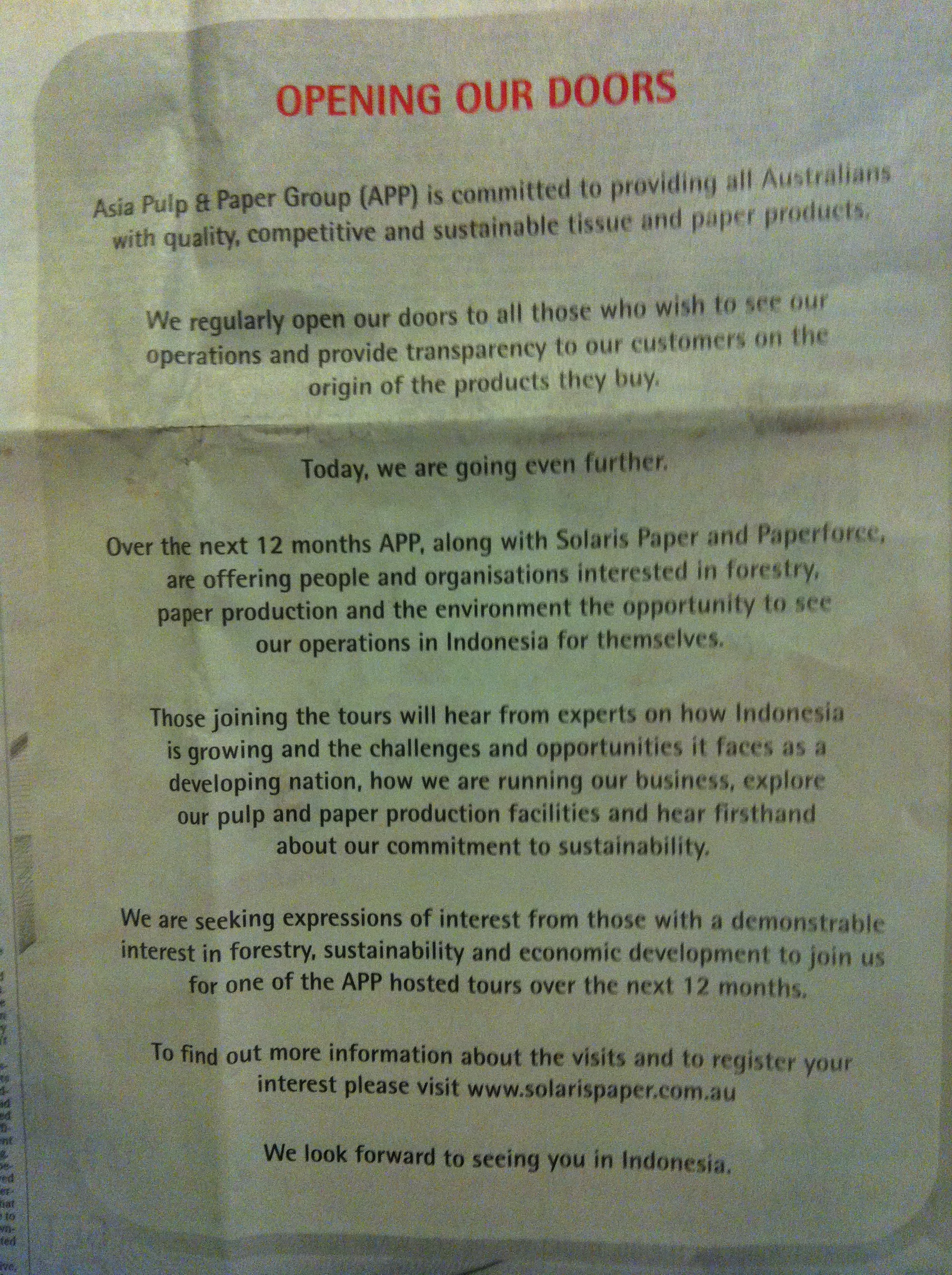 The ad, which is running in newspapers including The Sydney Morning Herald today, announces the launch of a program offering those “interested in forestry, paper production and the environment the opportunity to see our operations in Indonesia for themselves”.
