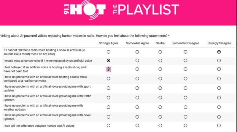 The survey also contains a number of statements that test whether listeners “have no problems” with an AI voice presenting sport updates, traffic updates, weather updates, or news updates.