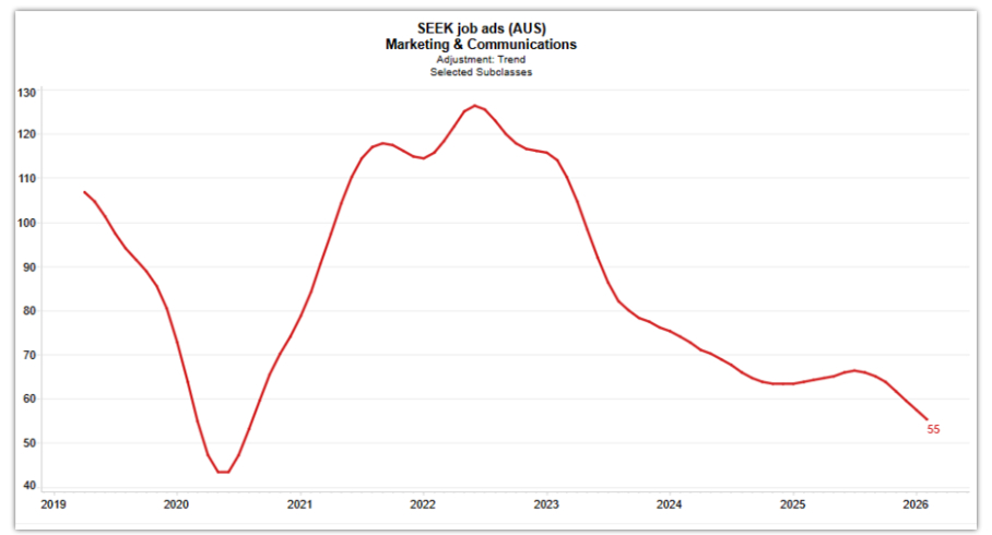 A graph provided by Seek that shows relative job ad supply in marketing and comms. Note the Y axis is an index, not absolute numbers (Seek)