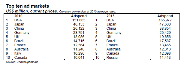 Australia is expected to hold its rank as the world’s eighth largest advertising market by 2013, although its position is under threat from Canada and fast-growing Russia.