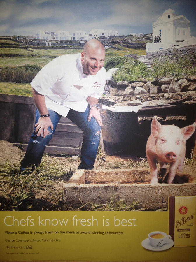 Dr Mumbo is disturbed by what MasterChef’s George Calombaris looks like he’s about to do to this pig. And curious as to how a creative department went from the idea of fresh coffee to a celebrity chef attacking a swine.