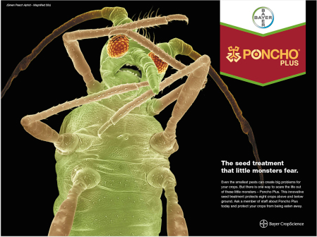 The first print campaign launches a new product called Poncho Plus that protects crops from a range of sucking and munching pests both above and below the ground, with the campaign featuring images of bugs recoiling in fear.