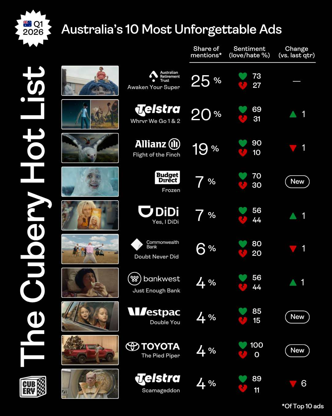 The Cubery Hot List asks Australians each week to recall one ad that has stuck with them recently, regardless of whether they love it or hate it. This longitudinal research is a marker of salience, rather than popularity, with the most recalled advertisements often splitting the audience in regards to whether or not they actually like the commercial.
