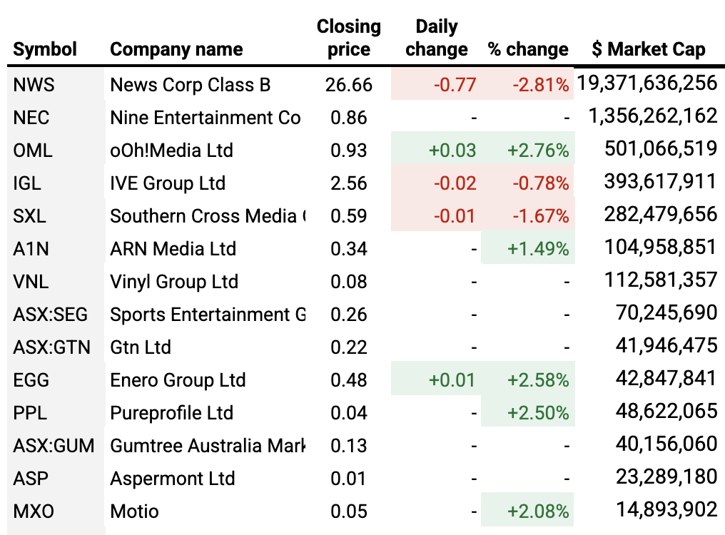 Aside from ARN, other gainers today were Ooh Media (+2.76%), Enero up 2.58%, Pureprofile up 2.50% and Motio up 2.08%