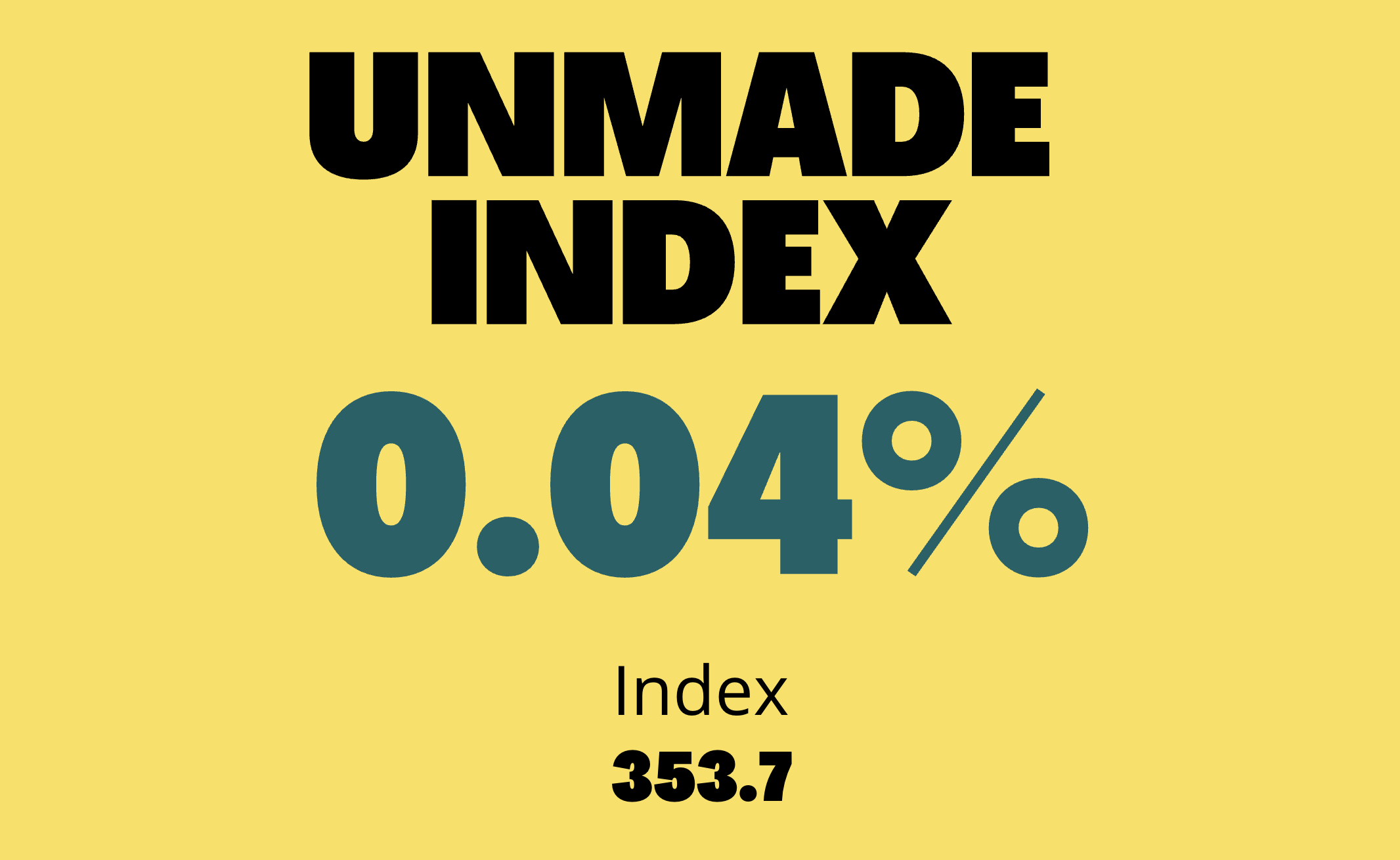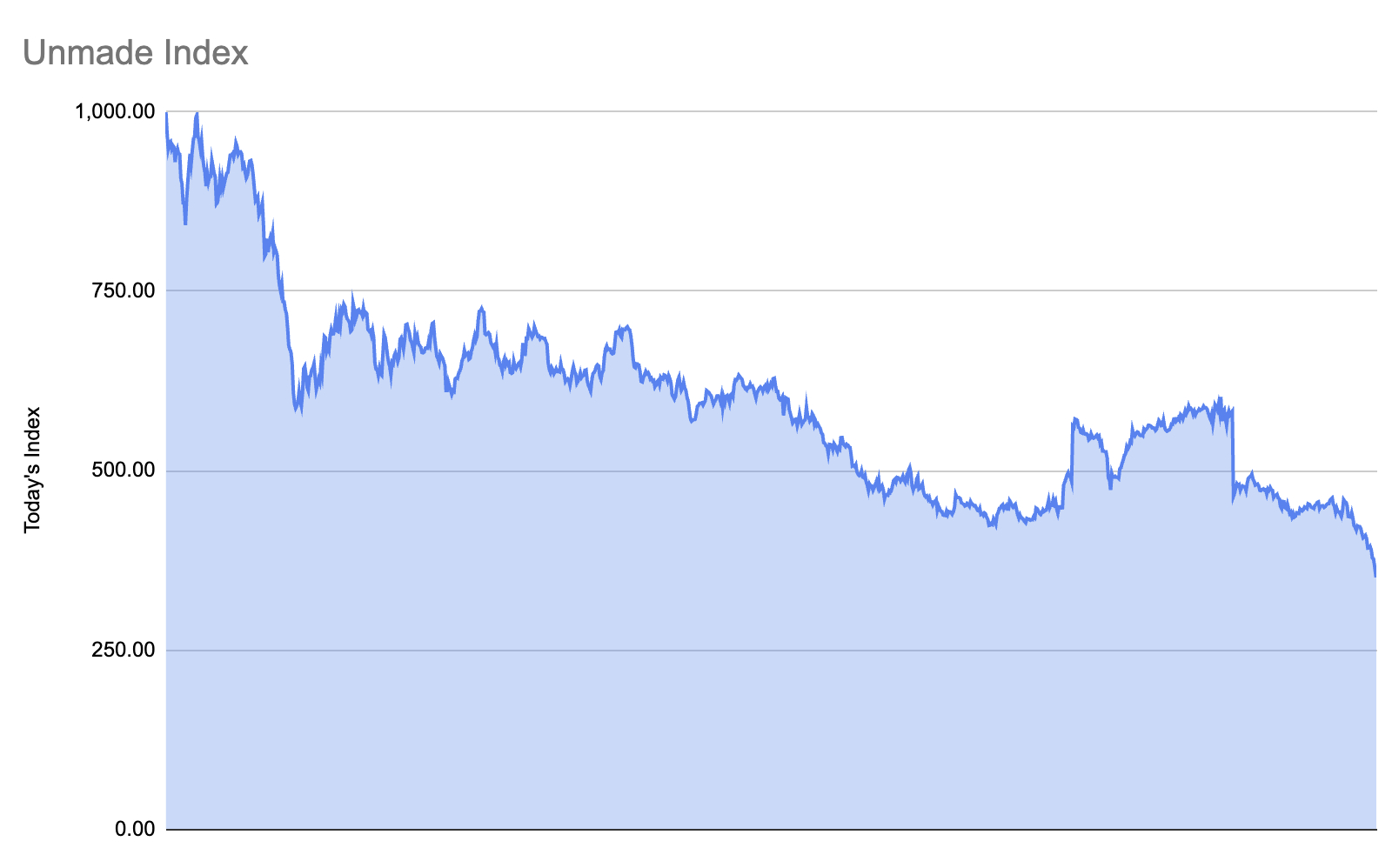 You don’t need a trendline on the graph below (which shows the Index from day 1, 6 January 2022) to know that the Unmade Index’s decline has a fairly steep gradient over the past two weeks.