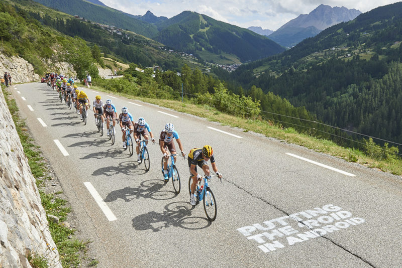 Described as ‘guerilla advertising’, the latest piece of work sees the app’s slogan, ‘Putting the ‘roid in Android’, painted on various sections of stage 18 at Col d’Izoard.
