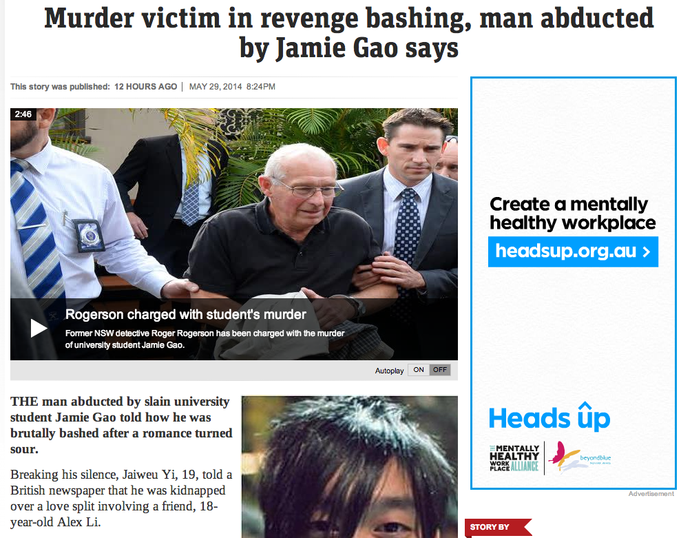 The story of Jamie Gao’s murder has gripped Australia, but not made massive headlines overseas. So what could News.com.au possibly mean, when in the second paragraph of its lead story this morning it says: “Breaking his silence, Jaiweu Yi, 19, told a British newspaper that he was kidnapped over a love split involving a friend, 18-year-old Alex Li.”