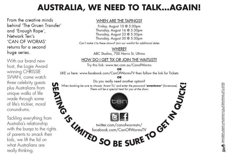 Zapruder’s Other Films has won Avant Card’s Postcard of the Month competition with a card that invites people to attend the taping of chat show Can of Worms, which is now running on Ten.