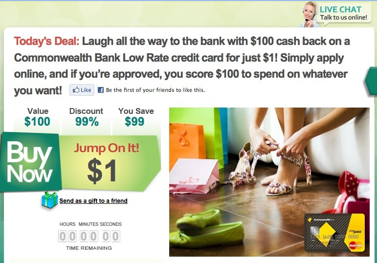 From tomorrow, customers using the Jump On It/Living Social platform can apply for a CBA credit card that will give them $100 cash-back for $1.
