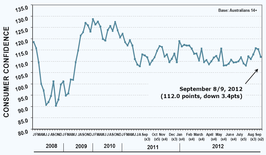 The softening in consumer confidence has been driven by Aussies having less confidence about the Australian economy over the next 12 months, less certainty about their finances compared to a year ago and fewer people saying that now is a good time to buy major household items, according to the research firm.