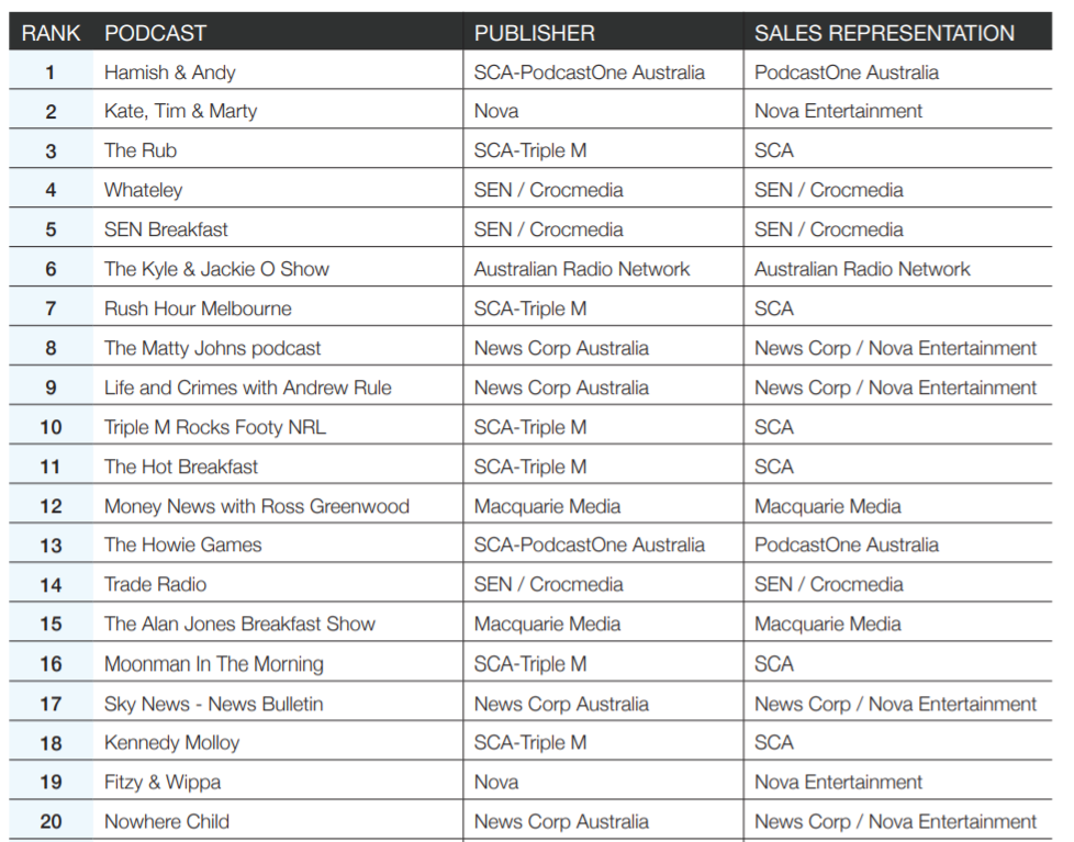 The ranking, announced today at the Radio Alive conference in Brisbane, launches with a foundation group of podcast publishers including News Corp Australia, Podcast One Australia, Nova Entertainment, Southern Cross Austereo (SCA), Australian Radio Network (ARN), Macquarie Media and SEN/ Crocmedia.