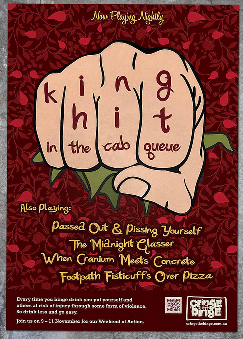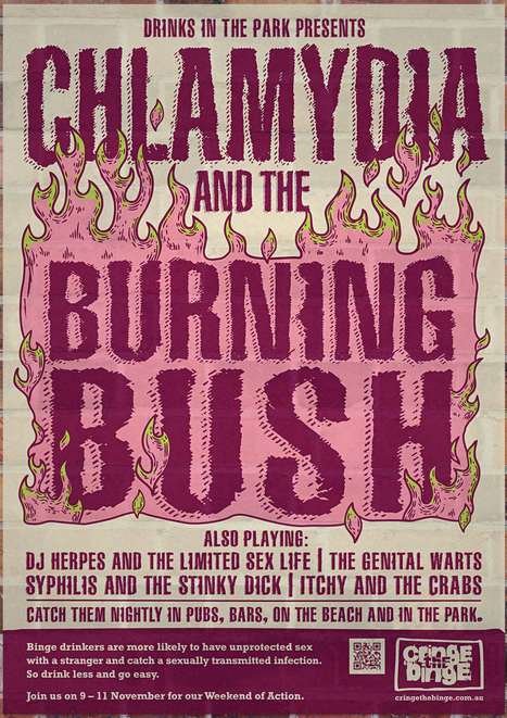 Created by Brisbane agency Decoder in the style of gig posters, the ‘Cringe the binge’ campaign tackles some of the outcomes of binge drinking, such as sexually transmitted diseases, adolescent brain development, alcohol–fuelled sexual violence, social embarrassment and mental health issues.