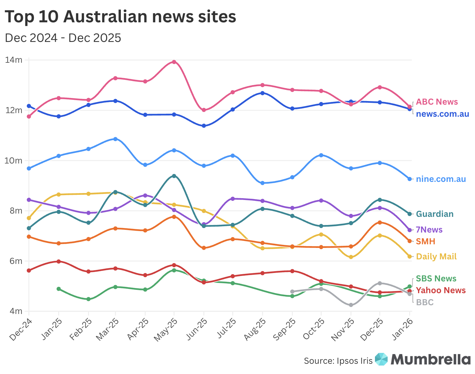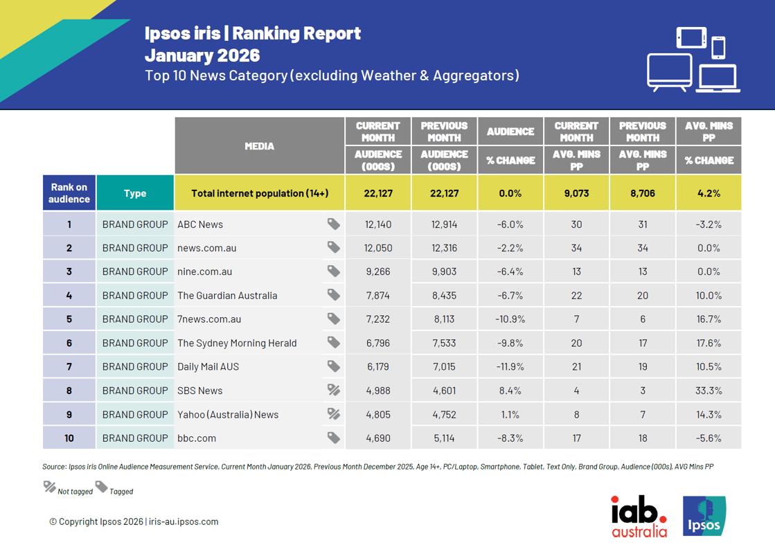 Eight of the top ten websites fell from December, which saw a spike in traffic due to the Bondi shootings. SBS and Yahoo were the only publications to improve on their December traffic.