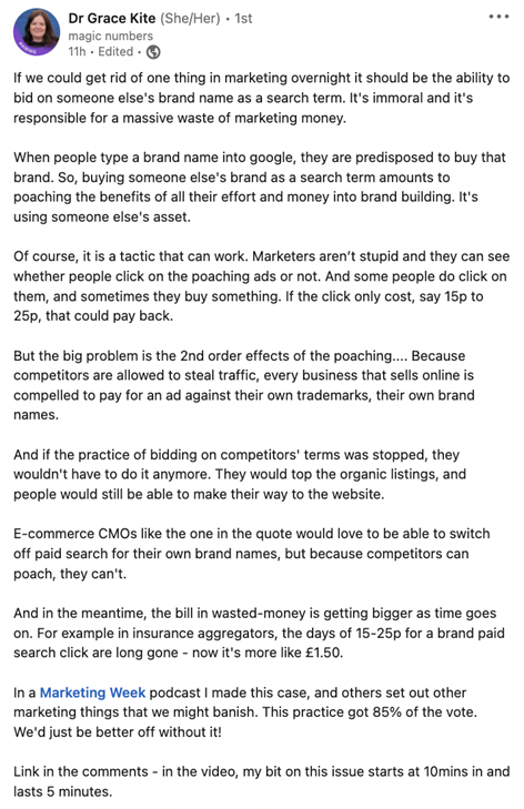 I saw a post by a fellow colleague in the econometrics space, Dr Grace Kite, targeting brand search. In it she lays out the case (eloquently) against branded search. She suggests brands are largely bidding against their own trademarks.