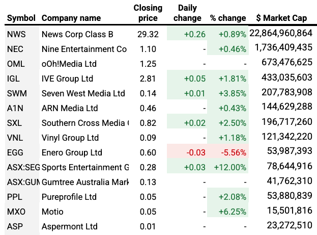 Agency owner Enero was the only Unmade Index stock to falter on Thursday, losing 5.6% to land on a share price of 60c at the end of an otherwise strong day for Australia’s listed media and marketing stocks.