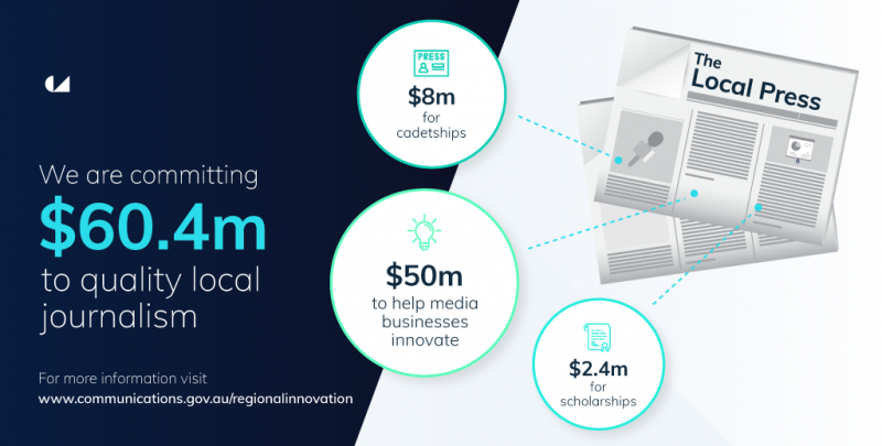 Under the training component of the package, the Government has committed to support up to 200 journalism cadetships over two years in regional and remote areas with a matching wage subsidy of up to $40,000 for each journalism cadet.