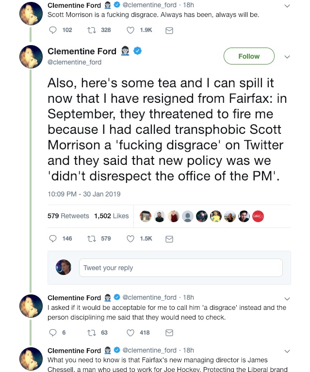 The ‘fucking disgrace’ comment was in a tweet Replying to Scott Morrison directly, which amps up the incident a bit.