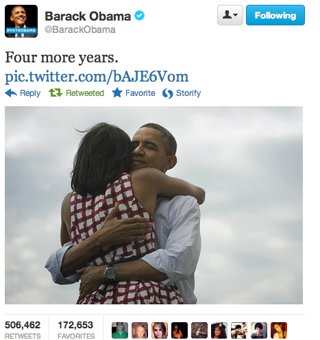 Within four hours of posting, the status update, which included a picture of Obama embracing First Lady Michelle Obama, had been retweeted more than half a million times.