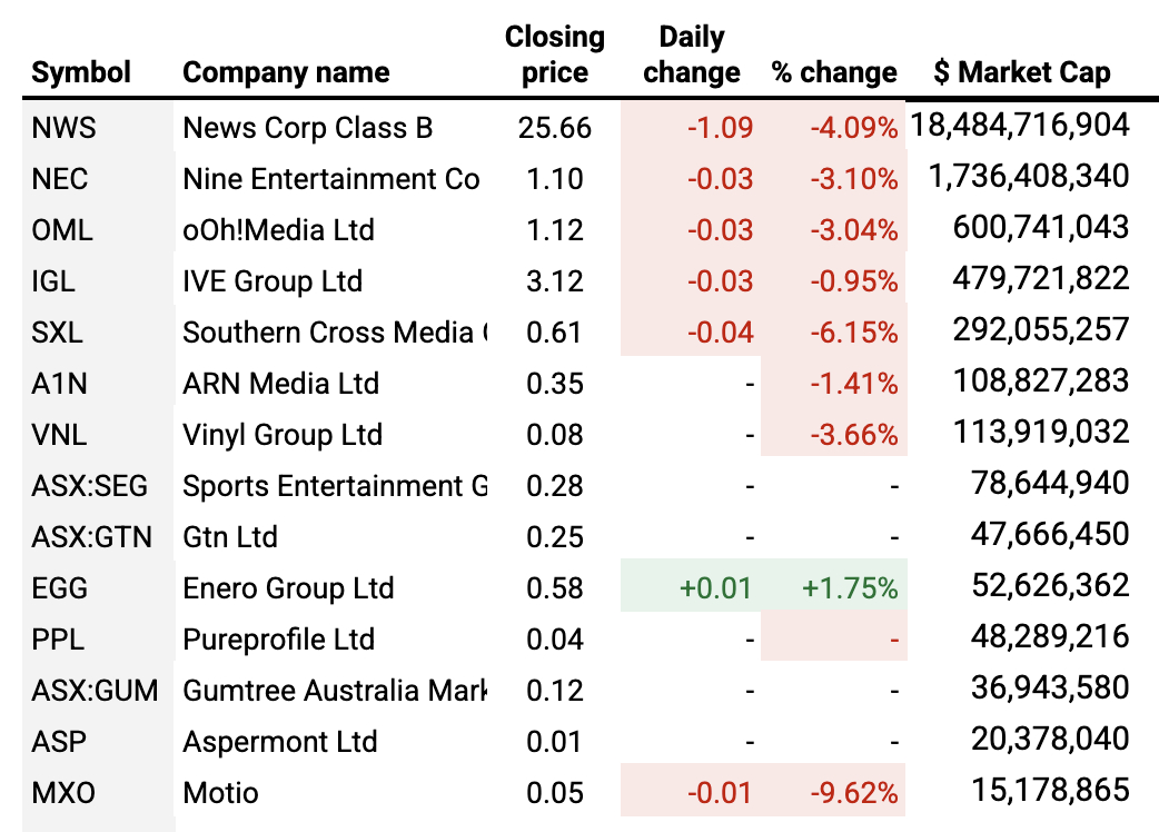 While the pain was widespread, some felt it more keenly than others. Southern Cross was punished (down 6.15% — falling back to a $292m market cap), News Corp was down 4.09%, Vinyl down 3.66%, Nine down 3.10% and Ooh Media down 3.04%.