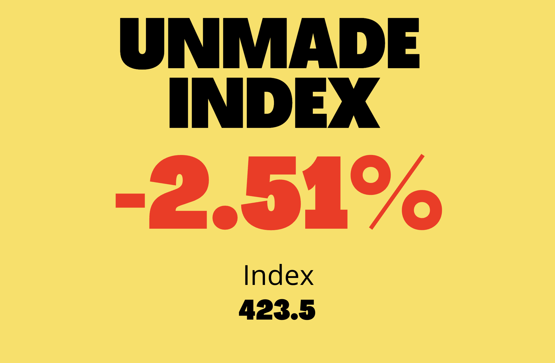 Today’s overall sharp fall (-2.51%) combined with yesterday’s solid hit have taken the Unmade Index into fresh territory: we are now sitting at a new low of 423.5, surpassing the previous low of 6 November 2024. Not the sort of record we can celebrate.