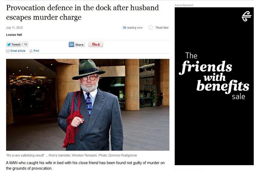 Awkward ad placement of the day goes to Air New Zealand’s new ‘Friends with benefits’ sale on SMH.com.au, plonked right next to a story about a man who caught his mate in bed with his wife.