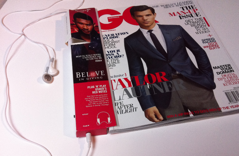 GQ has turned the spine of its October/November issue into a stereo, complete with headphones and an audio message from Usher, for advertiser Belvedere Vodka.