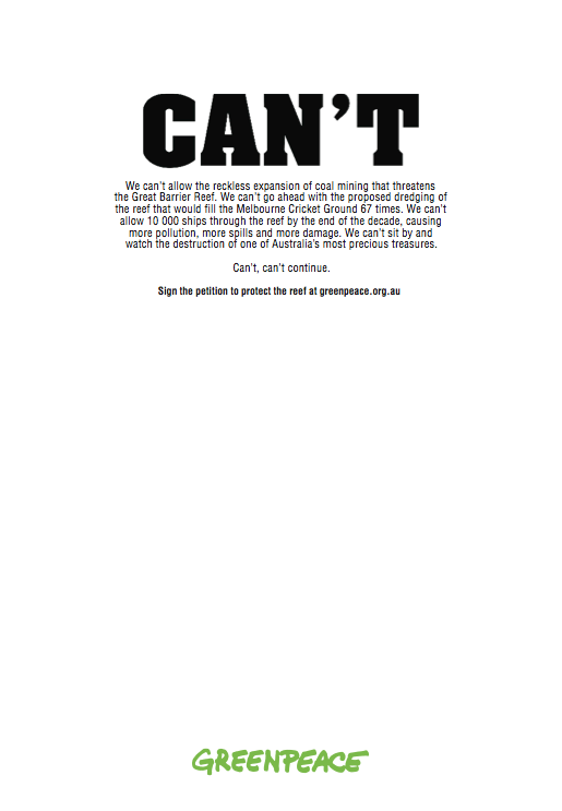 Greenpeace is the latest brand to piggyback the ‘Can’t’ teaser campaign, with a full-page tactical press ad in News Limited’s free commuter newspaper mX.