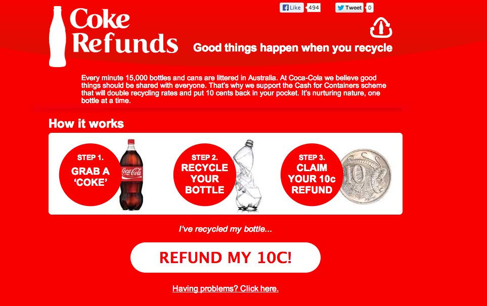 The website, which is a parody of Coca-Cola’s loyalty website Coke Rewards, talks consumers through a procedure for refunding 10 cents from the purchase of a contain then encourages then to click a button to get their refund.