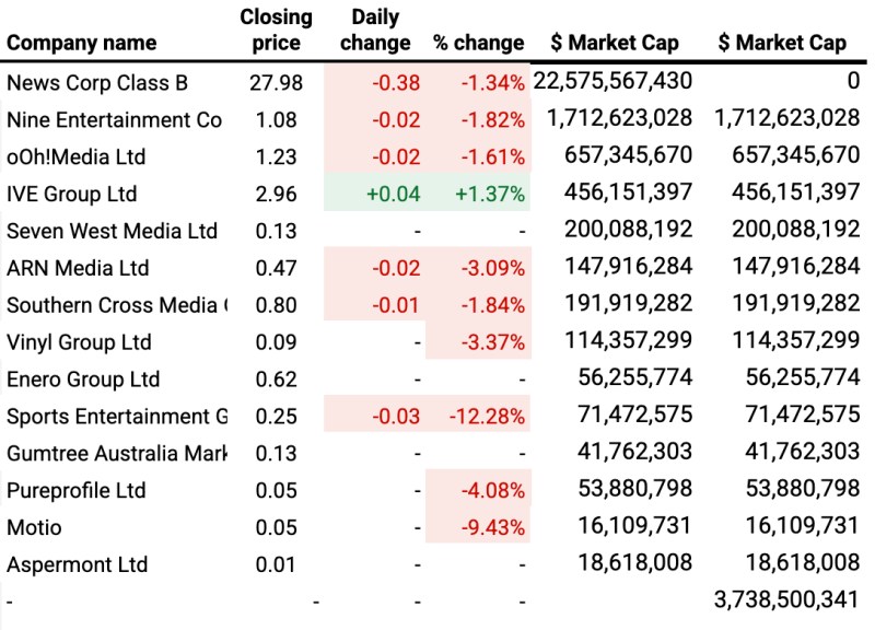 Everyone else drifted lower: News Corp down 1.34%, Nine off 1.82%, Ooh Media down 1.61%, ARN dropping 3.09%, Southern Cross down 1.84%, Vinyl easing 3.37%, Sports Entertainment Group falling an unpleasant 12.28%, Pureprofile down 4.08%, and Motio sliding 9.43%.