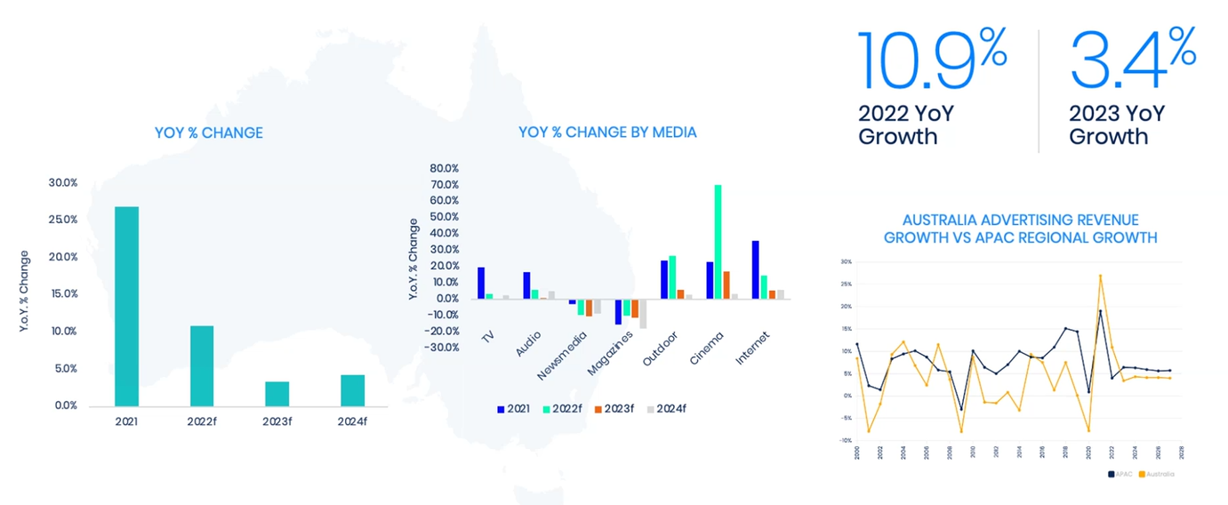 Locally, GroupM revised year-on-year growth for total TV in Australia from 4.8% down to 3.7% for 2022, driven primarily by the growth of connected TV, with the forecast for 2023 putting total TV at a small overall decline of 0.2%.