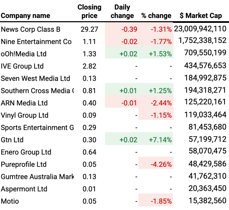 Staying in the audio sector, it was another down day for ARN Media which lost 2.4% to hit another all-time low, this time with a market capitalisation of just $125m.
