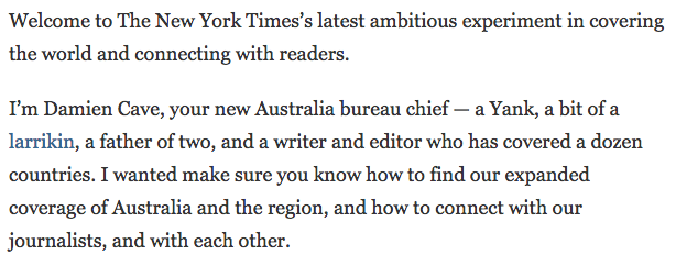 American Damien Cave tells readers: “I’m Damien Cave, your new Australia bureau chief — a Yank, a bit of a larrikin, a father of two, and a writer and editor who has covered a dozen countries.”