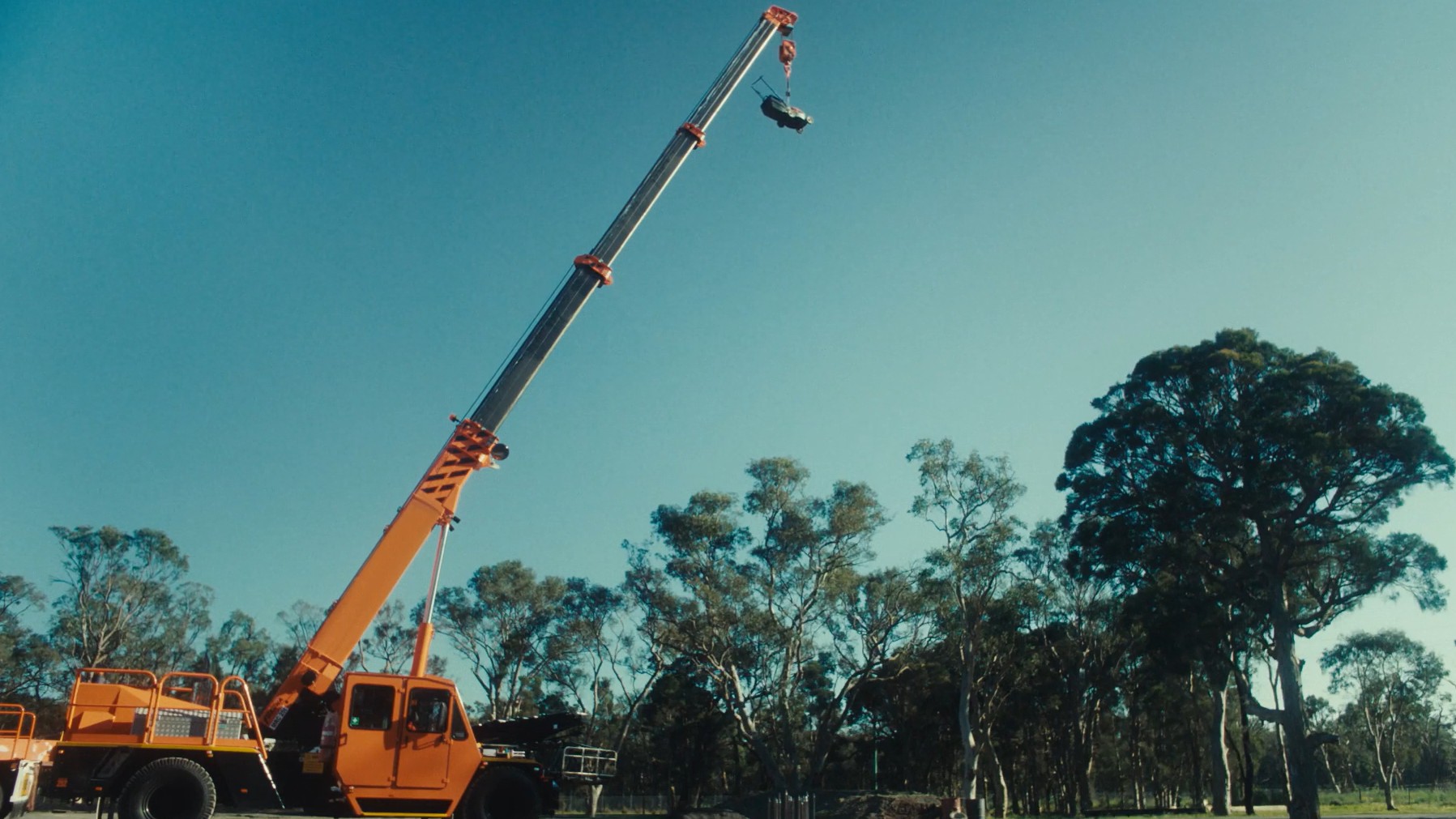 Wide shot: The lawnmower suspended from the crane