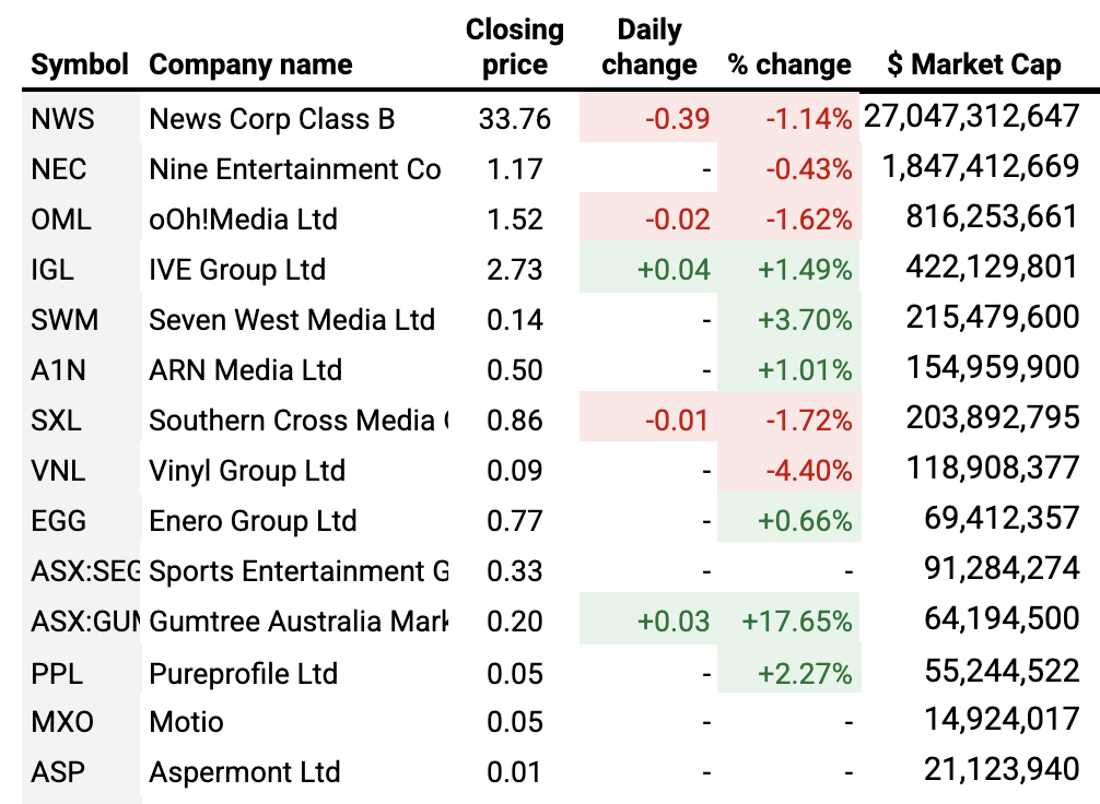 Meanwhile Southern Cross Austereo lost 1.7% and Ooh Media lost 1.6%.