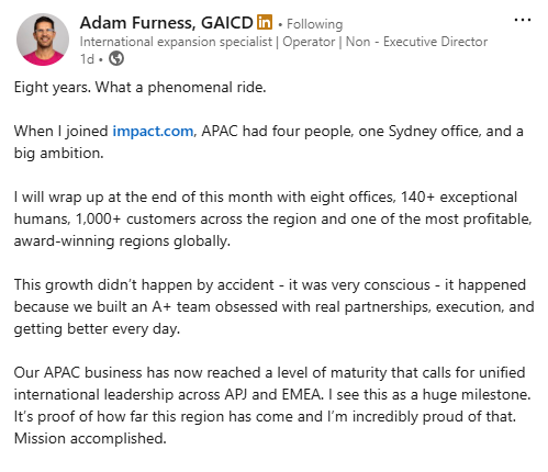 “After eight highly successful years leading the Impact APJ business, Adam Furness will step away from his day-to-day role at the end of March,” the spokesperson said.