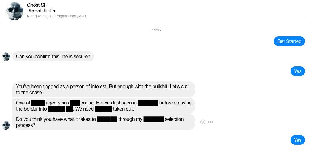The terse ‘Ghost SH’ chatbot aims to recruit potential assassins. Players are ranked on their ability to answer questions and complete the puzzles.