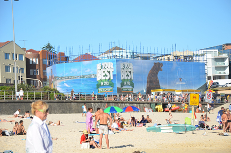 FMCG giant Simplot has used the construction site of the North Bondi Surf Lifesaving Club as a billboard for brand John West. Executed by out of home company Posterscope, media agency MPG with creative from BWM, the ad calls on passers-by to photograph themselves in a ‘face off’ with a grizzly bear and upload it to Instagram with the hashtag #beyourbest2013 to win prizes.
