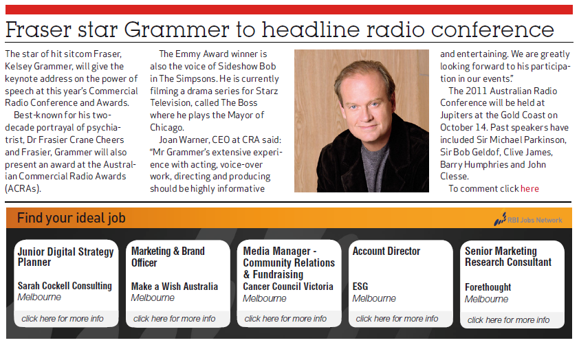 If only the surname of Frasier actor Kelsey Grammer, who’s to appear at the Commercial Radio Conference and Awards in October, was Spelling.
