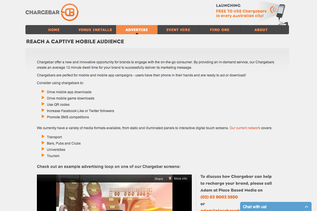 One is Chargebar, which launched its website 18 months ago. Its page telling the market about how to advertise on its kiosks looks like this.