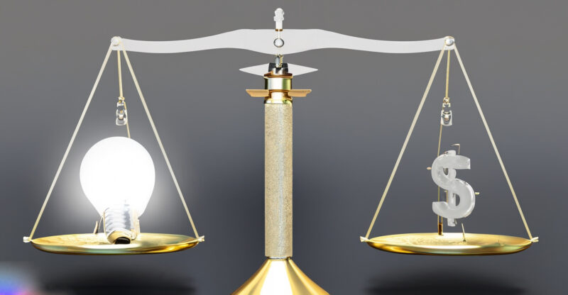 Adobe Firefly prompt: Scales with money on one side and a lightbulb on the other