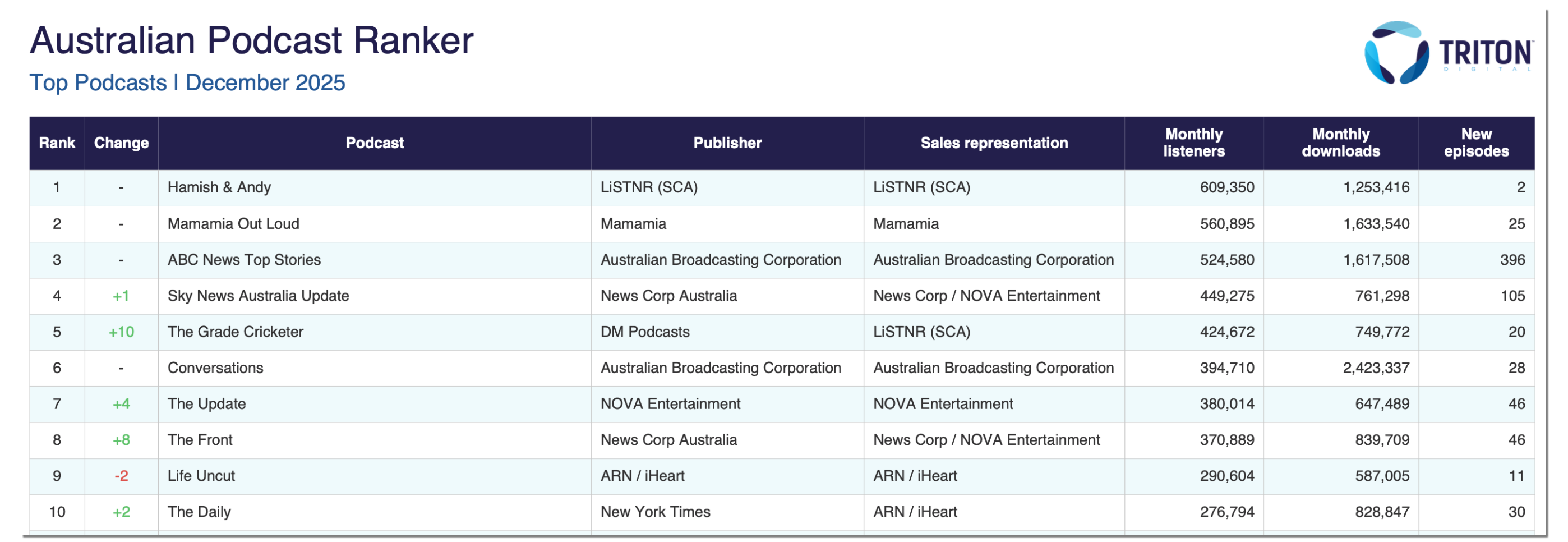 The next episode of the podcast will be released on April 1. As a Listnr podcast, they will be included in the Australian Podcast Ranker — a leaderboard which omits video podcasts and several podcast publishers — for the first time. In order to break into the top 10 (judging from December 2025 results), the reborn show would require well over 250,000 listeners.