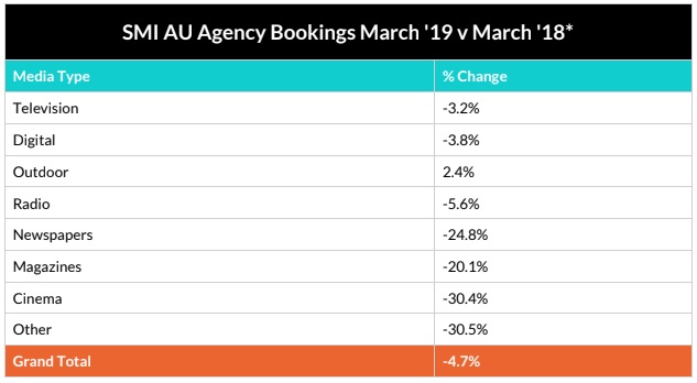 The SMI recorded poor results in food, produce and dairy (back 23%), retail (back 12%), and automotive (back 7.7%). Ad spend from political parties, industry associations and unions, however, doubled during March to $12m.