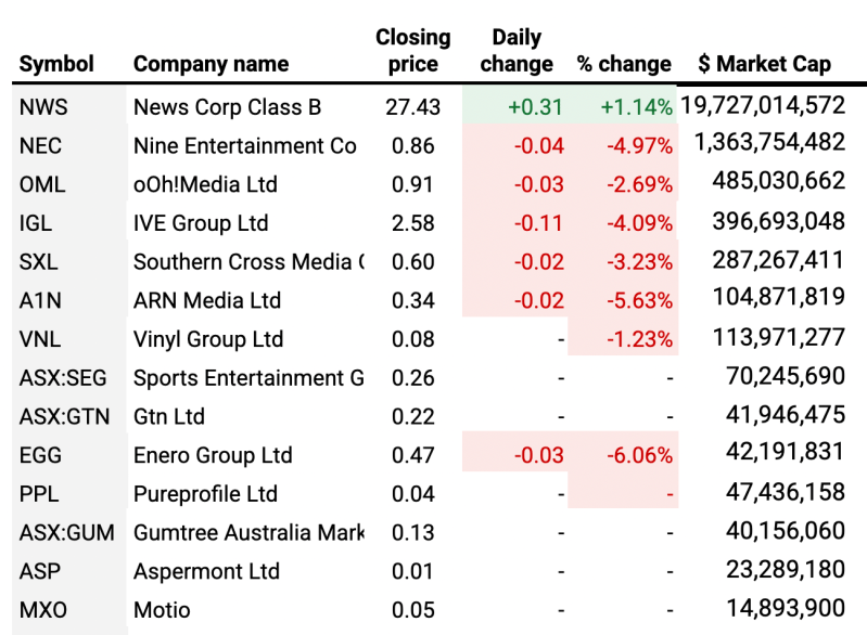 - ARN Media was worst hit, losing 5.6% to land on a market capitalisation of just $105m, the worst in the company’s 27 years on the ASX;