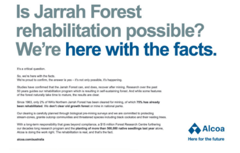 A print ad in a May edition of the West Australian newspaper outlined “the facts” of how Jarrah Forest in WA’s south-west region can “recover after mining”. The region is one of the world’s most biodiverse temperate forests, hosting over 800 plant species and 10 endangered animal species.